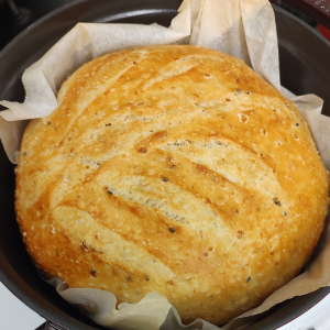 TIP: For a crustier, darker loaf, remove the Dutch oven lids during the final 5-10 minutes of baking. - When bread is done, remove baking containers from oven using oven mitts, and lift parchment paper at corners to transfer hot loaves to cooling rack(s). Let cool completely (about 3 hours) before serving.
