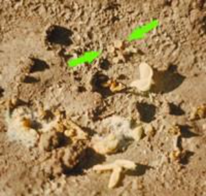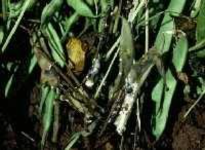 The fungus spores must come in contact with and colonize dead or senescent plant tissue such as flowers on the soil surface beneath the plant canopy. These colonized flowers also may be lodged in branch axils or stuck to developing pods. After colonization of this dead tissue, the fungus can then directly invade healthy tissue and produce the typical watery soft rot symptoms and subsequently new sclerotia. The disease then moves rapidly within and between adjacent plants in the field. White mold infection is often localized initially within the more moist and cool irrigation furrows and in low-lying areas of a field.