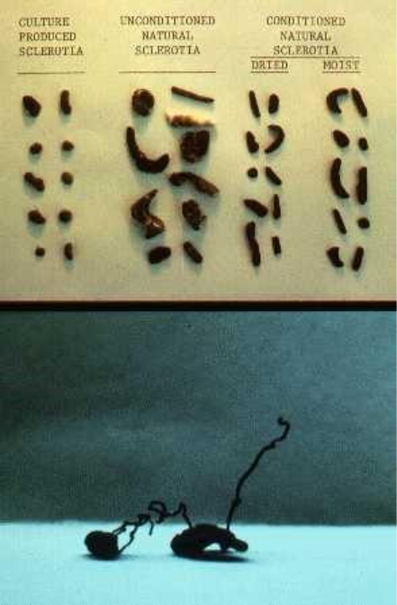 Since sclerotia provide the main source of initial inoculum, they must germinate before infection of bean plants can occur. A sclerotium may germinate by either of two methods. It may germinate directly by producing white mycelial strands, which seldom exceed 1/2 inch in length. These strands usually do not penetrate living plant tissue until after they have colonized dead or senescent parts such as flowers or leaves. This form of germination does not occur frequently in bean fields in western Nebraska or in Colorado.